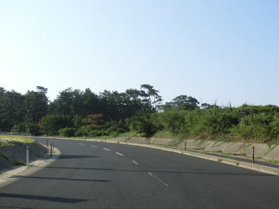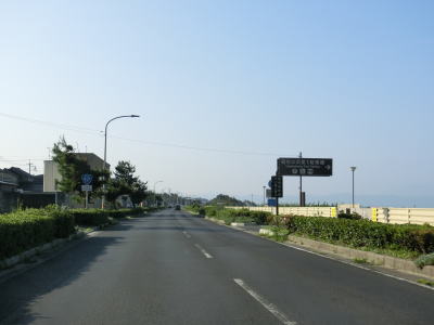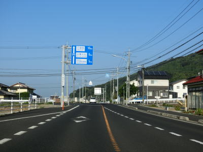 | 万代橋東交差点以降も平坦で見通しの良い2車線道路が続いている。くにびき海岸道路との交差点を通過する。道の駅「キララ多伎」と多伎しか案内されていないが、大田市に行く事もできる。新内藤川に架かる荒茅大橋の北詰で島根r351と交差する。 | ||