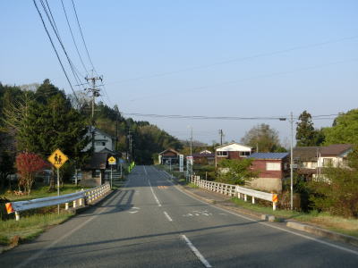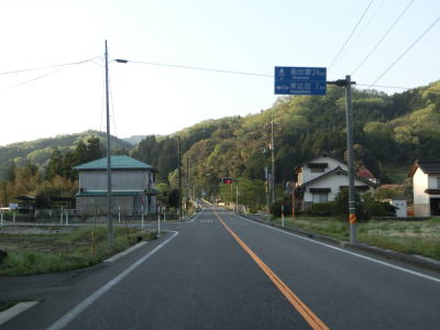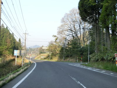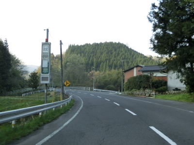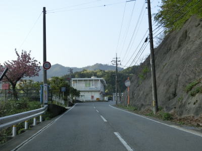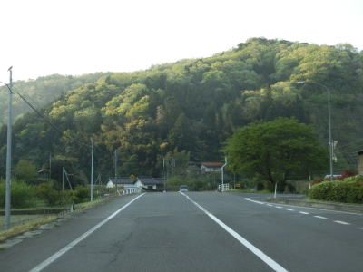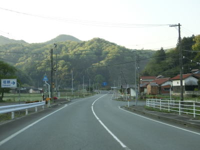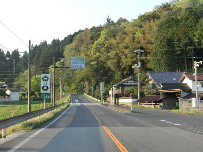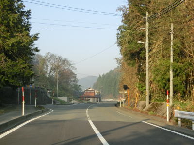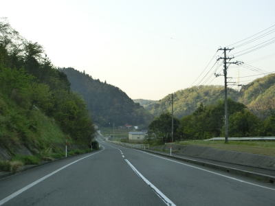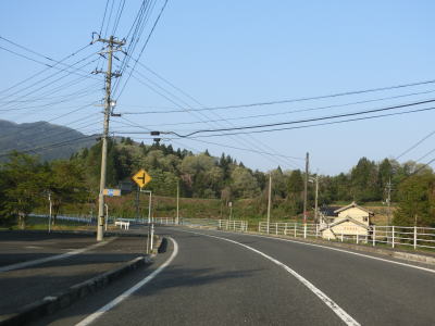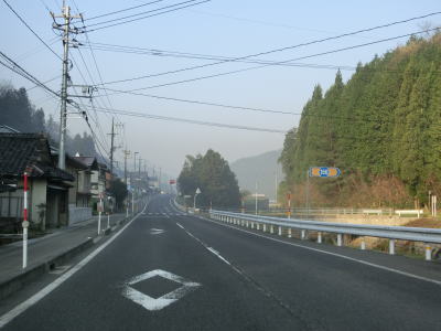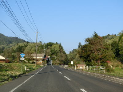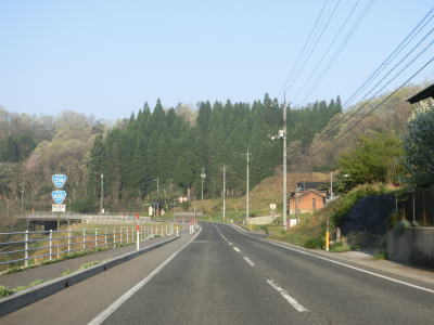 | 時折急なカーブを通過しながら飯梨川の左岸を走っていると西谷集落に至る市道との交差点を通過する。以降は勾配は変わらず緩やかなままだが急なカーブが多くなる。沿線には小規模ながらいくつかの集落が存在している。 | ||