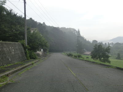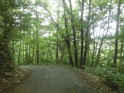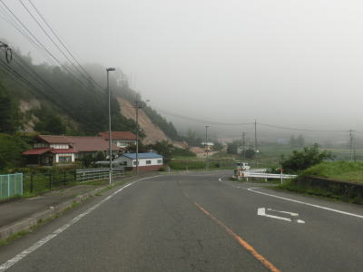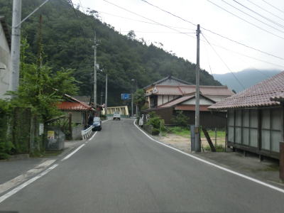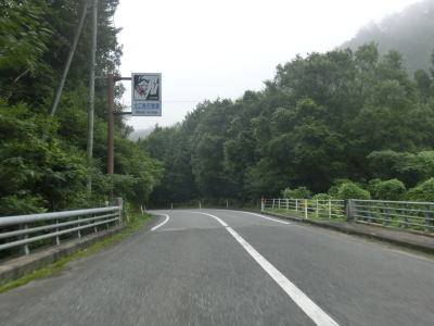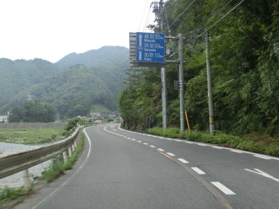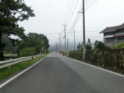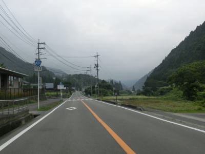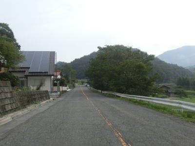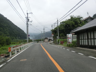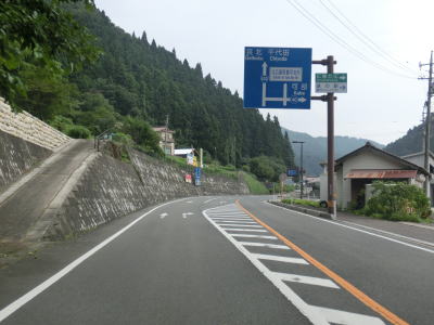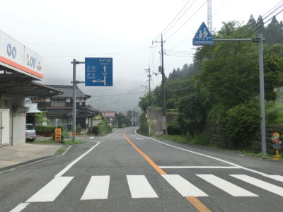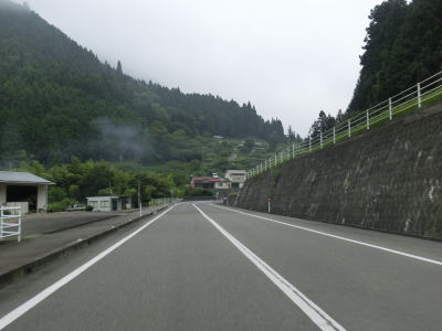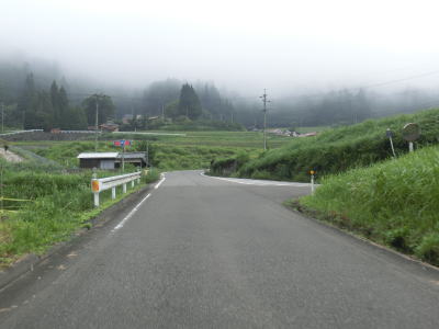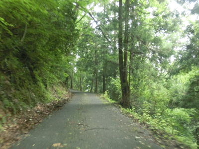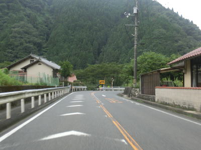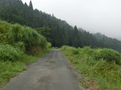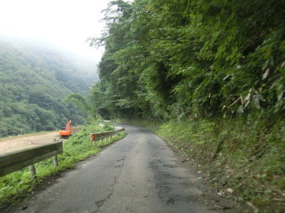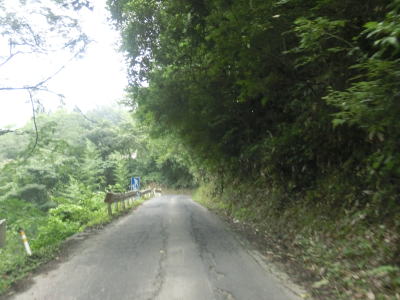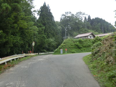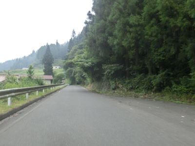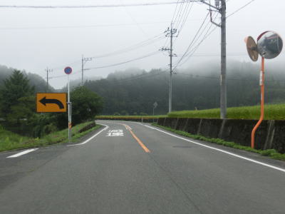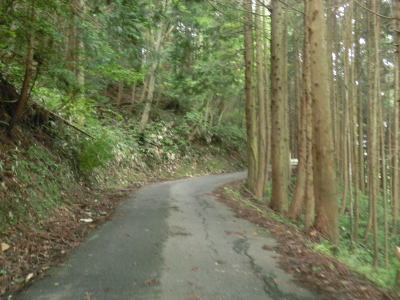 | 鋭角に右折すると急な上り勾配の1.0車線道路が待ち構えている。交差点から100m程は水田(と言っても放棄されているものが多いが)の間を走っているが、それを過ぎれば鬱蒼と生い茂った杉林に入る。ガードレールや退避所は設置されておらず、路上の堆積物やうっすらと生えた苔があるなどまさに酷道と言うに相応しい道路状況と言える。 | ||