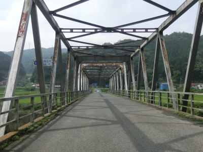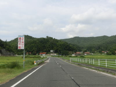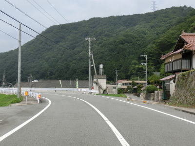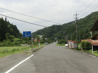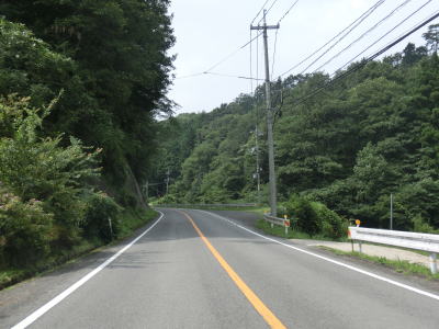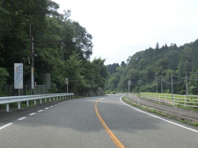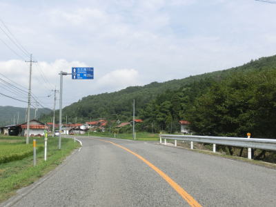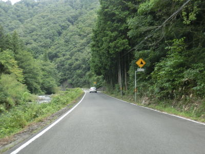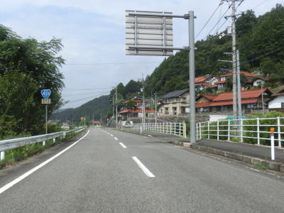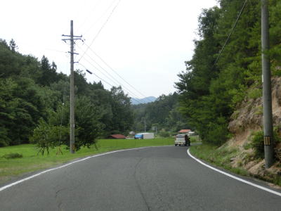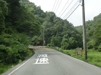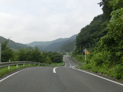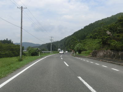 | r112交差点直後の右カーブを曲がるとセンターラインが現れて、緩やかにアップダウンする2車線快走路となる。しかし上式敷集落を過ぎるとセンターラインがなくなり1.8車線幅とやや狭くなってしまう。とは言え江の川沿いのR375重複区間に比べると道幅は広く、見通しの良い明るい雰囲気とあってさほど走りにくいとは感じない。カーブも緩やかなものがほとんどで、唯一の急カーブは野部集落手前の左ヘアピンカーブくらいである。 | ||
