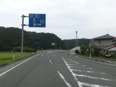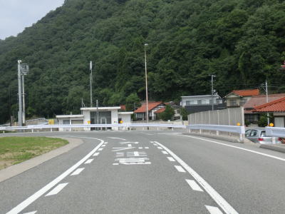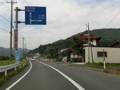 | 藤原集落以西は急カーブもなくなり平坦な2車線道路を気持ちよく走る事ができる。江の川に架かる川戸大橋を渡ってからは上り勾配となるが、特別急勾配という訳ではなく走りやすいと言える範疇にある。上りから下りに転じてやや急な勾配を下っていると浜田道の下を通過するが、センターラインがなくなってしまう。 | ||