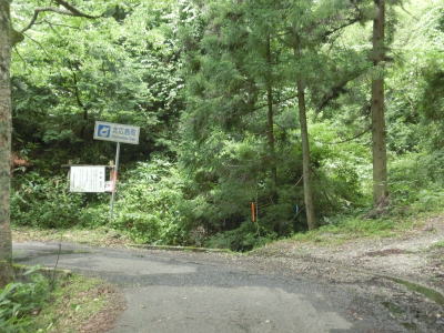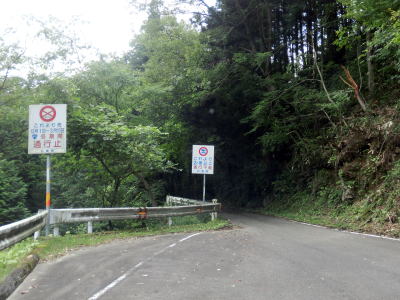 | 二重谷川を渡る左ヘアピンカーブの内側に養魚場のような建物があり、カーブの直後は2.0車線幅の広さがある。そこには改めて冬期閉鎖と2t車以上通行不能である旨を警告する標識が立てられている。後者の標識には「この先」となっており、ここが最終転回場としての機能を持っている模様。ただし、あくまで1.0車線ではないというだけで転回に充分な広さを持っているとは言い難い。 最終転回場からも1.0車線幅の狭路が続いている。谷筋かつ生い茂った樹木に日光を常に遮られており日当たりが悪いようで路面は苔むしている。ガードレールが設置された箇所もあるが設置されていない方が多い。 |