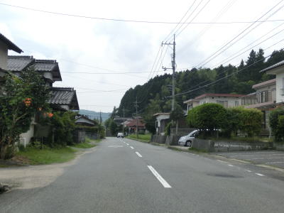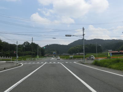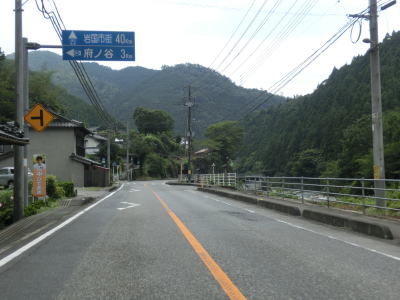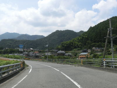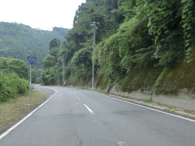 | 菅野湖畔を離れて少し走ると沿線の家屋が密集する間を走るようになる。勾配は緩やかでダム湖が近くにあるとは思えない状況である。勾配を下り切った所で交差点を通過するが、この交差点はR376およびR434の旧道との交差点であり、案内標識には左右の道路におにぎりが消された跡が残っている。旧道との交差点からは上り勾配となるが、緩やかな勾配で名もなき峠を越えて下りに転ずる。 | ||