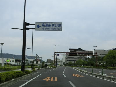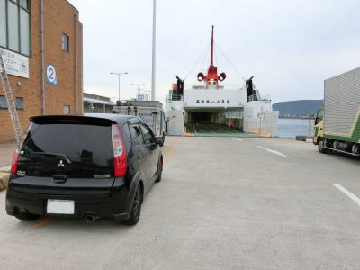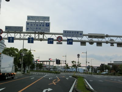 | 四国フェリーの土庄港行きの乗船口は国道の端点から西北西に700m程の位置にある。サンポート高松玉藻交差点を北上して信号機のない十字形状の交差点を右折すると乗船待ち車両待機所がある。ただし、待機所に並ぶには岸壁の左側を走行して先端部で180度周ってターミナルビルの前で待つ形になる。今回は平日の1便目で乗船客が少なかったせいか、乗船口の手前で待機するにように指示された。 車両を待機所に置いた後は他の多くのフェリーと同様に車検証を持ってフェリーターミナル内の発券窓口で乗船券を購入する。往復の他に四国〜小豆島〜本州という回遊という形態でも購入可能である。四国フェリーの高松港〜土庄港航路は6時台から20時台までの15往復もある。距離は約22kmでちょうど1時間の船旅である。 定刻通りに出港、入港して土庄港に到着する。土庄港側端点へは下船して2車線道路を直進して突き当りを左折し、高速船乗場の前のロータリーに接続している交差点が端点である(ロータリーは国道に含まれていない)。なお、高松市内は全てR30と重複していたが、フェリー航路から単独区間となっている。 |