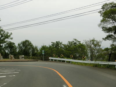 | 橘集落に差し掛かると勾配が幾分か緩やかになる。集落の向こう側に拇指嶽や千羽ヶ嶽らしき岩山が見える。下り勾配が終わる手前に幅員減少の警戒標識が立っており、その直後にセンターラインがなくなって道幅も1.8車線とやや狭くなる。橘橋を渡った先の左側に空き地が確認できるため、拡幅の計画が存在しているようである。 | ||