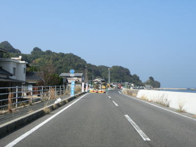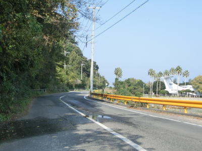| 急カーブの先には海上自衛隊の飛行艇PS−1が展示(?)されており、その隣にはキャンプ場や戦艦陸奥の記念館がある。海岸線に沿って走っていると小伊保田集落を通過する。小さな河川に架かっている橋が補修のため片側交互通行規制が敷かれていた。 | ||