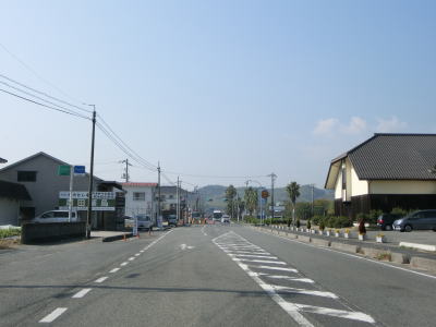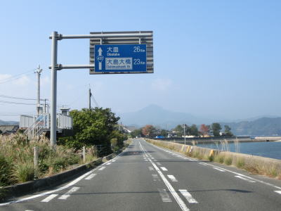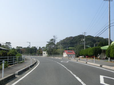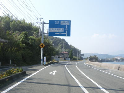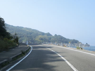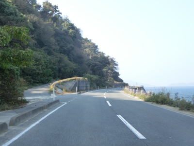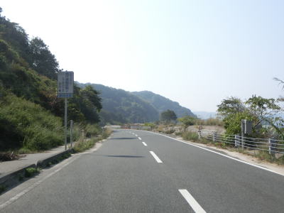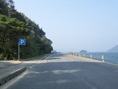 | 海岸線に沿って走っていると和田集落の中で町道油宇和田線との交差点を通過する。町道を進むと屋代島の中ほどを走る大島オレンジロードという広域農道に行く事ができる。内入集落でも町道との交差点があるが、島の南沿岸の小泊集落までの距離は1kmと短く、幅の狭い部分である事が分かる。集落が途切れてからも快走路が続いている。所々に簡易パーキングが設置されているが、土砂が溜まっているものもあった。 | ||
