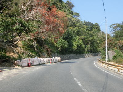 | 小伊保田集落を走っていると大雨の際に通行止になる旨の警告がなされているが、具体的な雨量は記載されていない。集落を過ぎると少し標高が上がるが海沿いという点に変化はない。内陸側にも道路が見えるが、おそらく旧道であろう。現在の国道との接続箇所は特に閉鎖はされていないが、土砂は樹木で埋まっていそうな場所もあるので通り抜けできないと思われる。 | ||