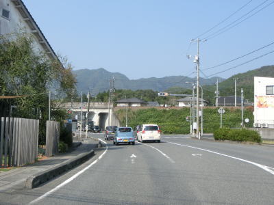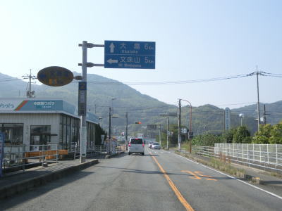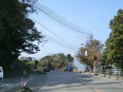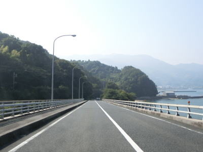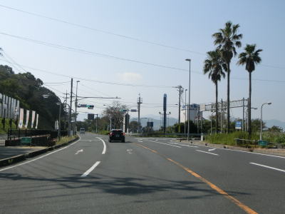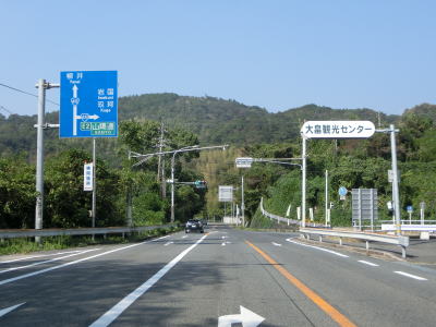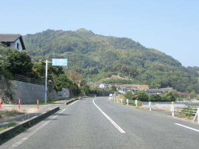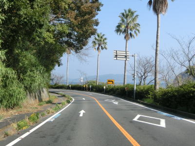 | 海沿いを走っていると椋野集落を通過する。田ノ尻鼻の内陸部を走っていると前方に海が見えるようになるが、これから渡る大島大橋が見えてくる。大島大橋が視界から外れると集落に入り、山口r106文珠山入口交差点を通過する。r106は文珠山公園線という路線名で、r101と同様に島の南岸ではなく文珠山の山頂の手前までの県道である。 | ||