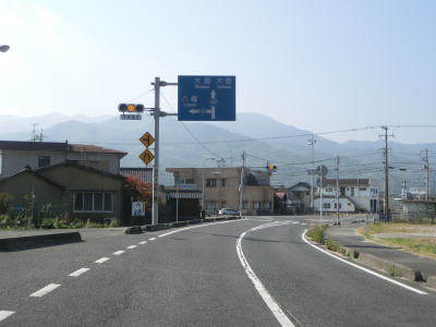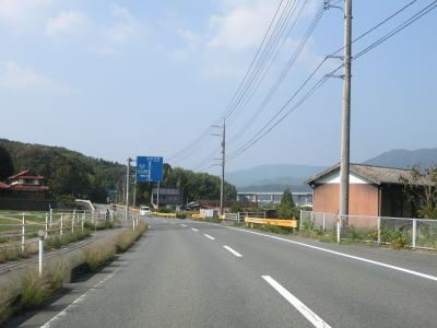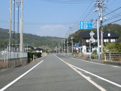 | 73.R437支線との交差点を右折 | 74.交通量が減少する | 75.「玖珂22km 日積7km」 |