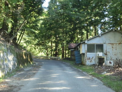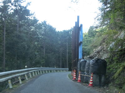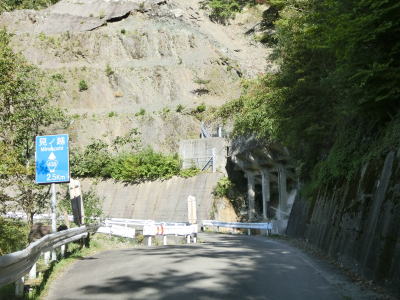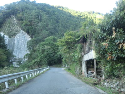 | 法面が崩落している場所を通過するが、元々道幅が狭い区間であり通行には全く支障はなかった。鮎喰川を離れて緩やかな上り勾配の狭路を走っているとシャングリ・ラ園という食事やバーベキューなどができる施設の前を通過する。 | ||