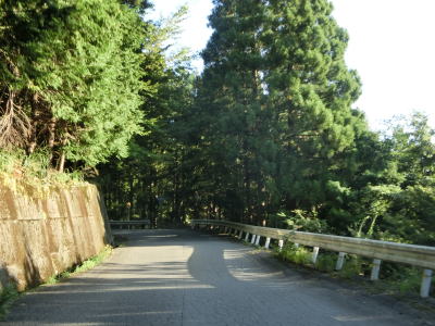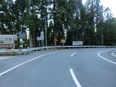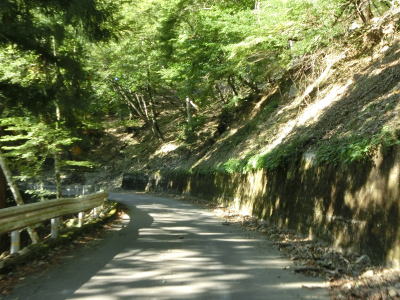 | コリトリから約7.6kmで左のヘアピンカーブを曲がるが、そこには中尾山高原に至る林道が接続している。この林道を走ると中尾山高原グラススキー場付近で徳島r260の分断区間を結ぶ太合実平林道に行く事ができる。 林道との交差点以降も道幅はほとんど変化が見られないが、路肩の堆積物が多くなり、谷川のガードレールの凹みも目立つようになる。一貫して勾配が緩やかなため高所に来たという印象は薄いが、標高は1200mを超えている。コリトリの標高が700m程度なので勾配の割に高低差が大きい。 |