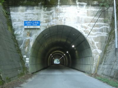 | 1.5〜1.8車線幅の山岳狭路酷道を走っていると倉羅川井峠林道が交差している左カーブを曲がった先で川井隧道をくぐって美馬市に入る。全長は186mと府能隧道とほぼ同じだが、幅は広く制限高も0.3m高い3.6mとなっている。トンネルを出た直後に左側に乗用車が15台ほど停められる無料の駐車場が設置されており、その先は林道が繋がっているがチェーンが離れており進入できないようになっている。 | ||