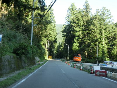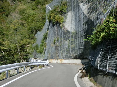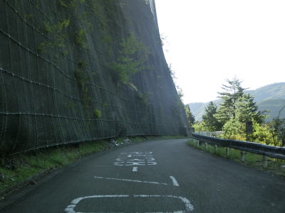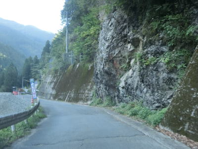 | 視界が開けた山岳狭路酷道を走る。道幅を広げる工事をしていると思われる場所を通過するが、元々の道幅が1.0車線幅しかないため片側交互通行規制では作業ができないため、時間帯通行止規制が敷かれてしまう。見ノ越まで2.5kmの地点の法面はモルタル(?)が剥がれかけている箇所もあり、石だけでなく本来それを保護するものが落ちてくる可能性もある。 | ||