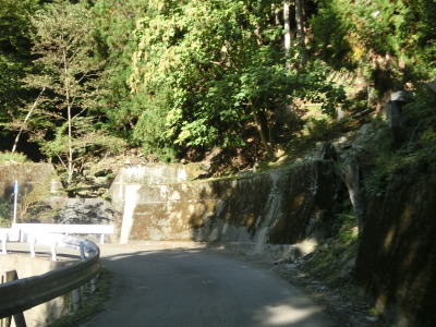 | 滝の宮橋から300m弱進むと改良済み区間が終わって1.0〜1.5車線幅の狭路に戻ってしまう。軽自動車同士ですら離合できない1.0車線幅の区間には川寄りに片桟橋構造の待避所がいくつか設置されている。交通量は極めて少ないとは言えこの奥にも集落が存在しているため対向車が現れないとは限らない。 | ||