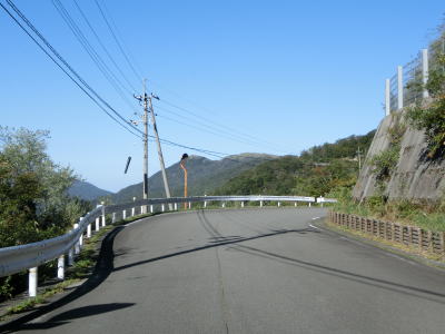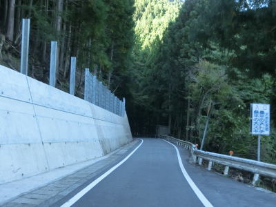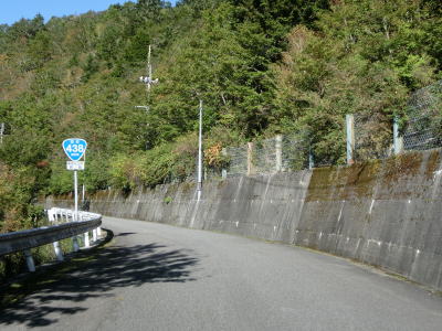 | R439・R492交差点からは道幅が少し広くなる。カーブは多く見通しは悪いが、南側の視界が開けており景色は良い。路面状況も比較的きれいで安定しているが、法面を見ると落石が防護柵に溜まっており、大雨でも降ればいつ崩れてもおかしくないような場所である。 | ||