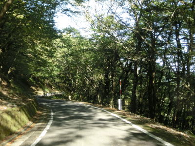 | 崩落跡からも1.5車線狭路が続いている。本来は交通量の少ない場所だが、見ノ越の駐車場に多くの車が停まっていた事からも分かる通り、時期によっては行楽客の車が多くなる。走行した日も見ノ越に向かう車両とのすれ違いが多く厄介であった。第六ヘヤーピンを通過して少し走ると菊水岩の前を通る。その辺りは道幅が広くなっているがカーブが多く走りやすいとは言い難い。その後道幅がまた狭くなり狭路を下っていると第五ヘヤーピンを通過する。第四ヘヤーピンから第三ヘヤーピンにかけてはは急カーブが多くなる。 | ||