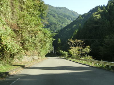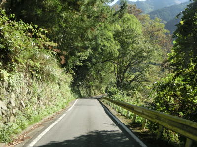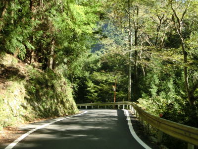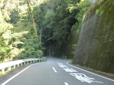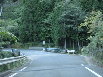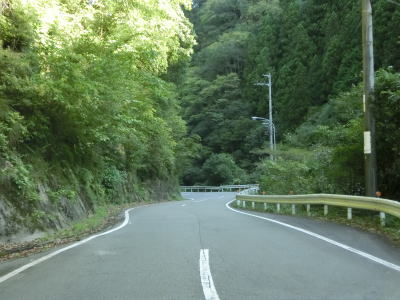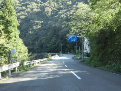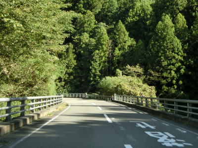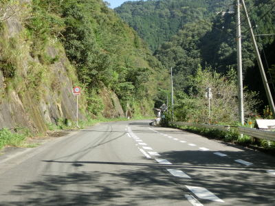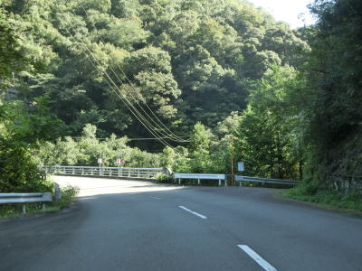 | 鳴滝の展望地点を過ぎるとセンターライン付きの2車線道路になる。川に沿っているためカーブは多いが日浦川向集落のものを除いて急カーブは少ない。やや急なカーブを曲がりながら友内橋を渡る。その先も2車線道路だが、旧道(ウオッちずでは現役扱い)との交差点の手前には短距離ながら道幅が狭くなっている箇所がある。 | ||