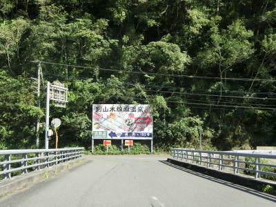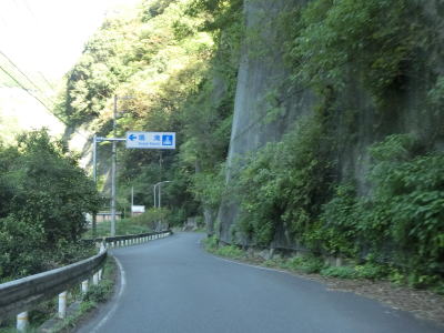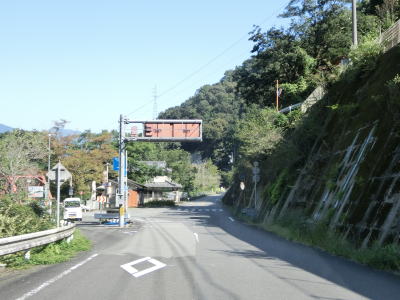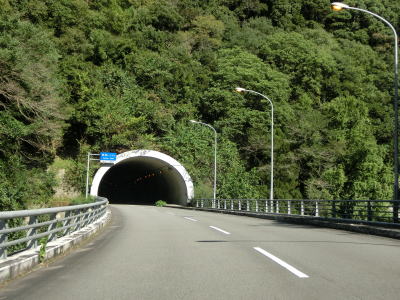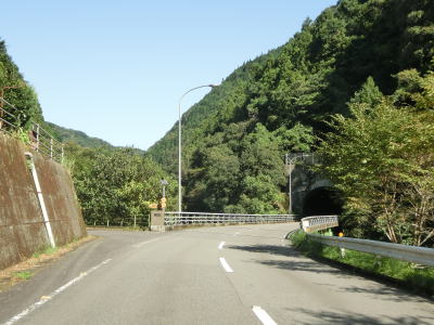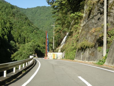 | 旧道と思われる町道との交差点の直後に土釜新橋を渡って土釜トンネルをくぐる。旧道に進むと土釜という名の滝があり、さらに猿飼林道を走ると鳴滝の傍まで行く事ができる。土釜トンネルを出ると旧貞光町に入る。法面崩落箇所を通過するが、これは5年半前に通過した頃から存在しておりその様子は全く変わっていない。通行止めになるくらい崩れてようやく工事が始まるのだろうか。その後は1.5車線幅道路を走っていると鳴滝と案内されている場所を通る。貞光川の対岸を望むと鳴滝が見えるが、展望台のようなものはなく廃業した土産物店(?)があるだけである。 | ||