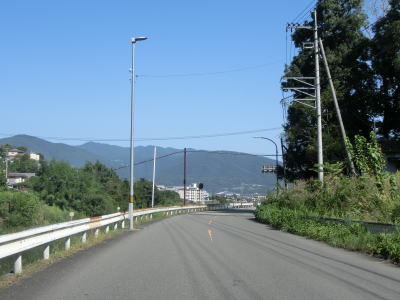 | 旧道らしき町道との交差点を通過するとセンターライン付きの2車線道路になる。久しぶりのオレンジ色の実線である。なお、町道の木綿麻橋は路線バスを除く大型貨物車と特定中型貨物車は南向きの一方通行である。片側交互通行規制が敷かれている法面の復旧工事現場を通過して少し走ると視界が開ける。つるぎ町の中心部だけでなく吉野川の対岸のE32徳島道の橋梁まで見える。 | ||