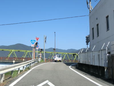| 徳島r261交差点直後の右カーブを曲がるとセンターライン付きの2車線道路になる。明渡橋3号と明渡橋4号を相次いで渡るが、それらの手前に1号と2号は存在しない。おそらくバイパスのうちの3号と4号が先行して整備されたのだろう。なお、明渡橋〇号となっているが、明渡〇号橋の誤りではない事を付け加えておく。 明渡橋4号を渡り終えてすぐにセンターラインがなくなって道幅も狭くなる。2車線になってすぐに一宇橋を渡る。上流側にある橋が旧道と思われ、現在は歩行者用の橋として利用されている。 |