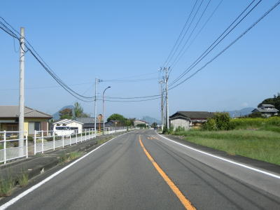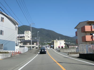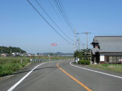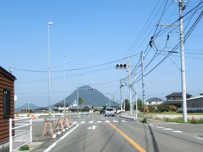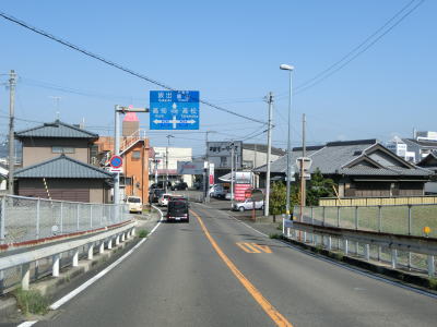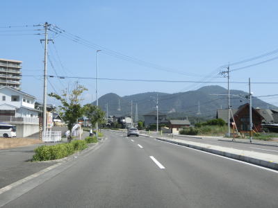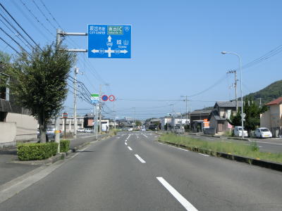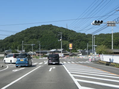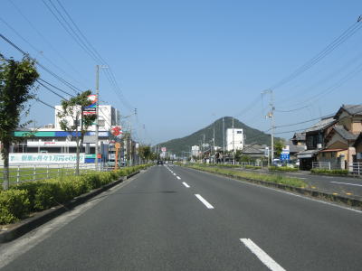 | 中新田交差点からも対面2車線道路が続いているが、交通量が明らかに増えているのが分かる。約600mでR438岡田バイパスとの岡田下交差点を通過するが、このバイパスはR32より南の区間が供用されていない。 讃岐富士と呼ばれる飯野山を正面に見ながら住宅地の中の2車線道路を北上していると、王子神社付近で連続している急カーブ区間を通過する。それ以外に急カーブはなく走りやすい道路状況である。 |