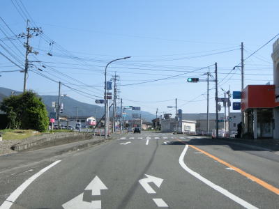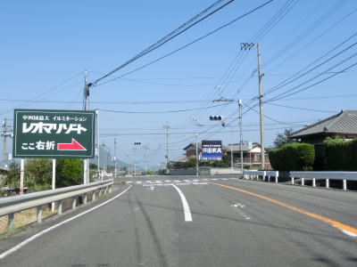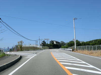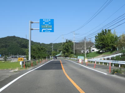 | 城山の山裾の平坦な2車線道路を走っていると香川r46・r197長尾交差点に至り、右折して坂出方面に進む。200m手前の案内標識には直角カーブがあるかのような描き方だが、実際はよくある十字形状の交差点である。 | ||