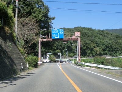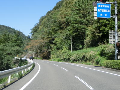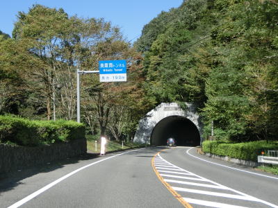 | 三頭トンネルを出て約600mで道の駅「ことなみ」を通過して美霞洞トンネルをくぐる。トンネルには川沿いの旧道らしき道路があるが、道の駅から続く遊歩道になっており、美霞洞渓谷を楽しむ事ができる。ちなみに美霞洞は“みかど”と読む。 渓谷を形成する明神川の谷筋を走っており、徳島県側に比べると勾配もカーブも緩やかで走りやすい。異常気象時通行規制区間の終点を通過するが、対象区間の延長は1.7kmである事から県境は含んでおらず道の駅付近までと思われる。時間雨量(30mm超)と連続雨量(150mm超)に加えて積雪深が20cmを超えた場合も通行止になる。 |