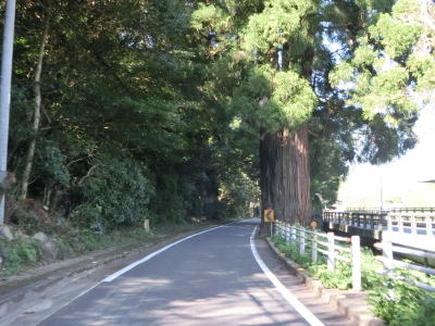 | 犬馬場橋から少し進むと香川r39交差点を右にカーブしながら通過し、以降もこれまでと同じ下りではあるもの勾配が随分か緩やかになる。天川神社の近くで上下線が分離するが、その間に三本杉と呼ばれる杉の巨木がある。樹齢は700年とも言われ、国道を拡幅する際に伐採しないで済むように上下線を分離する構造にしたようである。 | ||