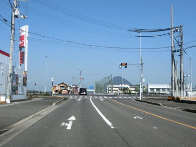 | 片側2車線道路を北上していると香川r189・r191六反地交差点を通過する。E11高松道付近で2ヶ所交差していたr191だが、ここで交差しているのは東に300m程しか県道に認定されておらず、中途半端な区間だけ供用されたバイパスの可能性がある。 坂出市の市街地の手前にある角山を望みながら片側2車線道路を走っていると緩やかな右カーブを曲がり、その先でR11・R319・香川r19川津交差点に至る。この交差点がR438の終点である。起点もR11との交差点であったが、両交差点間の距離はR438が約160km、R11が約100kmである。距離もさることながら道路状況もR11の方がはるかに良いため時間も圧倒的にR11の方が短くすむ。なお、R319はこの交差点が起点で、R11松山・丸亀方面に重複している。 |