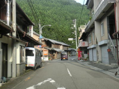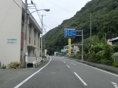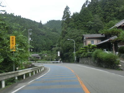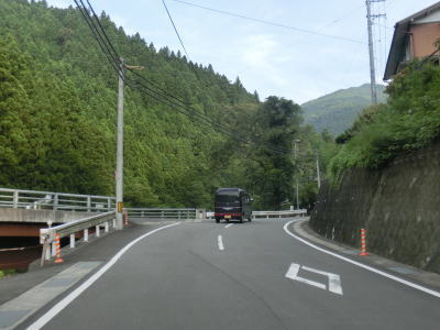 | バイパス工事現場を通り過ぎてすぐにセンターラインがなくなり道幅は1.5車線にまで狭くなる。所々に乗用車同士でも離合できない1.0車線幅狭路箇所があり、工事用の大型ダンプが対向車として現れた際は難儀するかもしれない。JAの椎茸菌床製造施設付近からはセンターラインのある2車線道路となり、鮎喰川に沿って大きくカーブした状態を走る。 JA施設からの2車線快走路を走っていると再びセンターラインがなくなり1.5車線幅にまで狭くなる。その後さらに1.0車線幅にまで狭くなる。そんな道路状況ではあるが集落の中を走っており、山岳酷道でありながら軒先酷道の要素も持っている。道路両側に家屋が密集している状態でセンターラインが復活するが、乗用車ならともかく大型トラックであればセンターラインをはみ出さないと走行できなさそうな2車線道路である。そんな道路状況でR193・R438との交差点を通過して、R439に加えてR193との重複区間に突入する。いまさら言うまでもないだろうが、R193は100番代という番号の割にかなりハイレベルな酷道で、那賀町方面には分断区間が存在している。 |