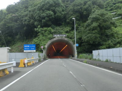 | バイパスに進むとすぐに路面にペイントされた17kmのキロポスト(?)を通過する。R195やR194にも路面キロポストがあったが、四国以外では見た事はない。緩やかにアップダウンする2車線道路を走っていると新府能トンネルをくぐる。トンネルの坑口の右上には2本のガードレールが見えるが、上のものだけがR439(R438)の旧道のものである。下の方は村道のガードレールである。なお現道の府能隧道の延長は180mで新府能トンネルは1387mである。また、前者は南北方向だが後者は東西方向を貫いている。 | ||