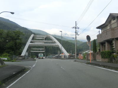 | 園瀬川に沿って大きく左にカーブした先で西地橋を渡るが、その東詰で右に直角にカーブし、橋を渡った西詰で市道との交差点を左折しなければならない。東詰は道なりに右に直角にカーブする形だが、西詰はT字路を左折する形なので国道が優先道路となっているとは言え直進してしまわないようにする必要がある。西地橋から少し走ると佐那河内村に入り、同時にセンターラインがオレンジ色の実線となる。 | ||