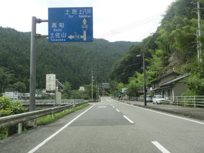 | 本山町の中心部に入ると吉野川の左岸を走ってきた高知r262との交差点を通過する。中心部を通り過ぎてしばらく走っていると次の土佐町に入る。町境付近で吉野川の流域から離れる。高知r17交差点を右折してr17を走れば吉野川に造られた早明浦ダムに行く事ができる。 | ||