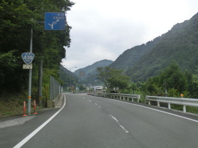 | 信号機のない新田交差点を右折すると平坦かつカーブの緩やかな2車線道路を走る。緩やかなS字カーブを描きながら北川1号橋を渡って左岸に移る。さらに進むと左にカーブしてから右にカーブして北川2号橋を渡る。橋の手前に大正・中平・R439と案内されている道路が交差しているが、これは町道である。R439が左折する北川交差点は北川2号橋と天忠トンネルの間の信号機のない十字路である。案内標識が設置されていないので油断していると通り過ぎてしまう。 | ||