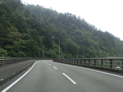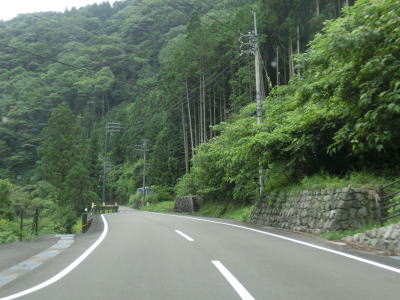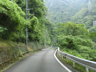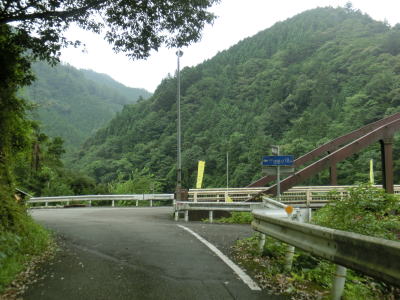 | 林道との交差点からは高野川沿いを走り、その高野川が北川に合流する付近で異常気象時通行規制区間が終わる。その後2車線快走路になる、というのがよくあるパターンだが、ここでは道幅も周辺の風景も一切変わらない。S字状にカーブして北川を渡って左岸に移ってからも道路状況に変化はなく、1.5車線幅の狭路を川に沿って走る。ガードレールのない区間も多いが、落ちても死ぬ可能性は低いだろう。 | ||