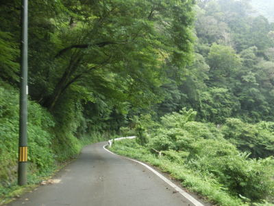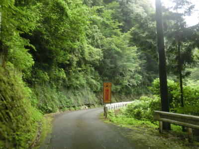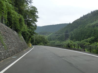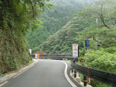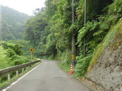 | 平坦だがカーブの多い狭路をひたすら走る。舗装のひび割れや凹凸はないがさすがに落石や落木の類が皆無ではない。初瀬ダムの南東で工事現場を通過したが、対岸に重機を置けるようにしておりかなり大規模な工事であった。さらに進むと2ヶ所目の工事現場を通過するが、こちらは単純な拡幅工事のように見えた。 | ||