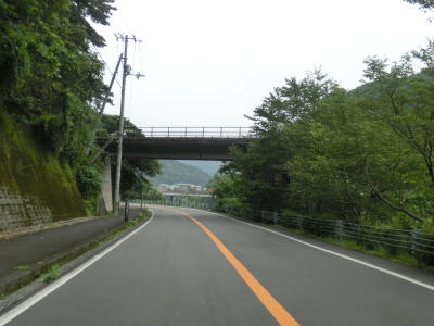 | 大正まで22km地点を通過すると足川川を渡るが、その川が町境となっており四万十町に入る。四万十町に入ったからと言って道路状況は周辺の風景に変化がある訳でもなく、檮原川沿いの狭路を走る。町境からさほど走らないうちに集落を通過するが、家屋が密集している訳ではないが、1.0車線と非常に狭い。集落を通り過ぎて少し進むと宗海橋という吊橋の南詰を通過する。自動車は通行できない橋だが、対岸の数軒の家屋との往来に利用されている。 | ||