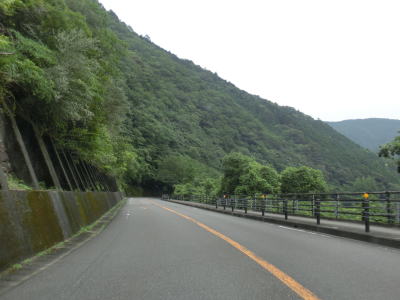 | 檮原町から続く異常気象時通行規制区間の終点を通過してすぐに左にカーブして架橋工事現場の脇を通過する。対岸の1軒の家屋のためだけの橋にしては立派過ぎるので、R439のバイパスの橋かもしれない。No.316の写真の大規模な工事はトンネル主体のバイパス工事の一部なのだろうか。 架橋工事現場を過ぎて少し進むとセンターライン付きの2車線道路になる。この2車線区間はすぐに終わる事もなくしばらく快走路が続いている。檮原川が蛇行している部分は小石トンネル、小石清流橋、江師トンネル、江師鮎踊橋で直線的に通過する事ができる。 |