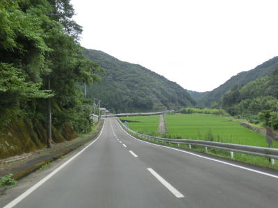 | 牛竹橋を渡って後川の左岸に移り、2車線快走路を淡々と南下する。谷が開けた所で高知r337との交差点を通過するが、鋭角な交差形状を見る限り、r337の一部は国道の旧道と思われる。アップダウンとカーブが連続している所で高知r332交差点を左にカーブしながら通過する。 | ||