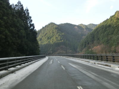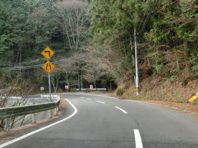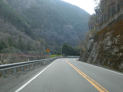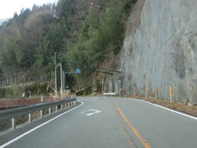 | カーブの多い2車線道路を走っているとセンターラインがなくなり道幅が狭くなってしまう。とは言っても距離は100mに満たず、乗用車同士であれば離合できる程度の幅は確保されている。センターラインが復活した後に新八釜橋を通過する。 | ||