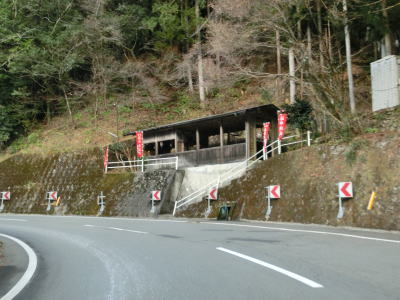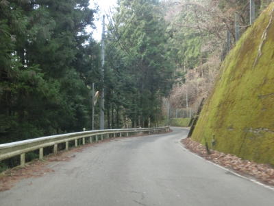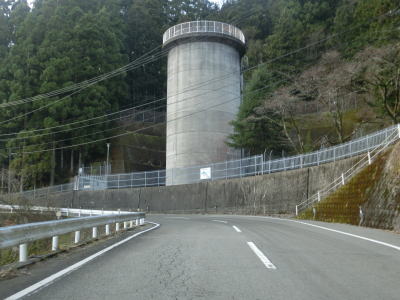 | 等高線に沿っているため勾配は非常に緩やかだがカーブが多い。とは言うもののセンターライン付きの2車線道路なので走りにくい道路状況ではない。柳谷発電所の巨大なサージタンクの前を通り過ぎた後に八釜甌穴群に至る徒歩道の分岐地点を通過する。さらのすぐ先で福地蔵の湧き水の前を通過する。湧き水を汲む場所としては屋根があるなど豪華だが駐車場がなく、前面道路に停めるか少し離れた旧道に停めるかのどちらかになってしまう。 | ||