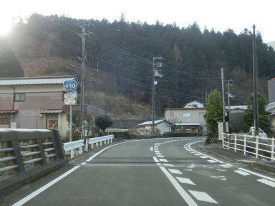 | 横野トンネルをくぐり、緩やかなS字カーブを描く横野橋を渡った後に横野集落を通過する。R440沿線に限れば県境までび最後の集落と言える。横野集落を過ぎると西谷大橋を渡るが、単純に黒川を渡っているのではなく川沿いに架けられており旧道の上も通っている。標高は650m程度で、晴れているものの気温が低く橋上は凍結している箇所もあった。 | ||