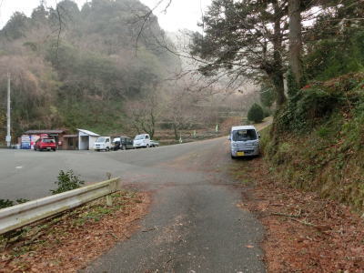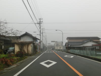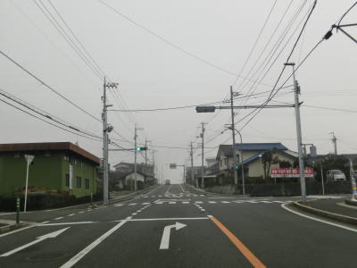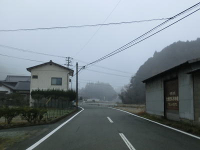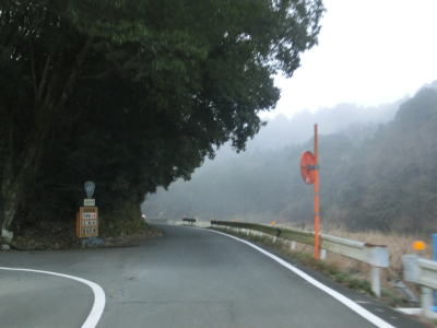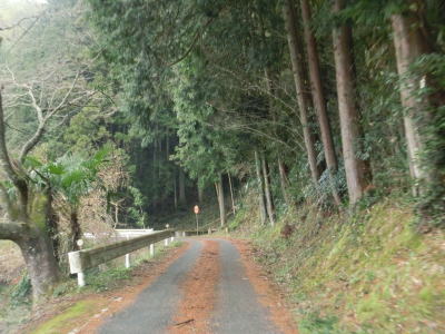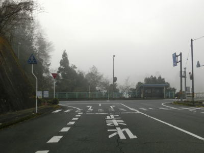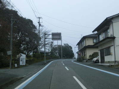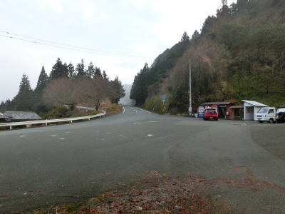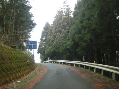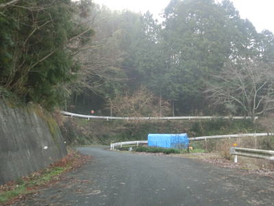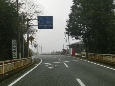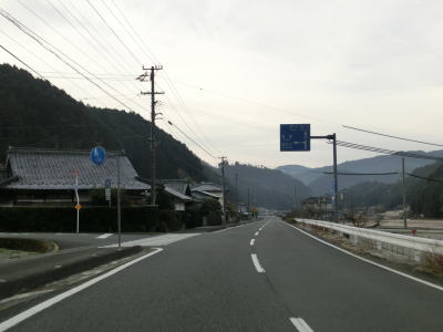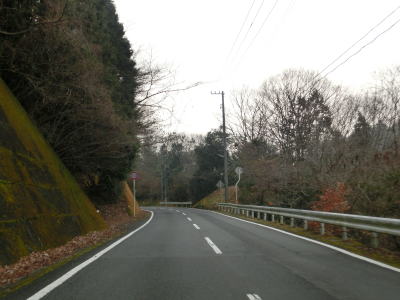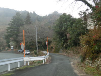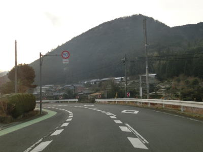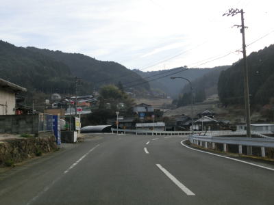 | 旧道めいた雰囲気の狭路を走っていると視界が開けて集落に差し掛かる。右のヘアピンカーブを曲がり、左側に道路が見えてきて、ごく緩やかな勾配を下った先で広域濃度との交差点に至る。交差点付近はアスファルト敷の広場のようになっており、交差点には見えない。 | ||