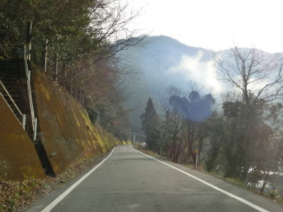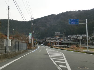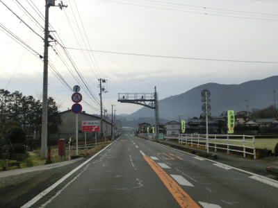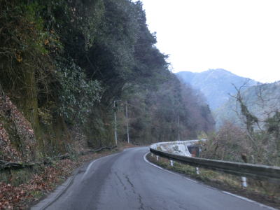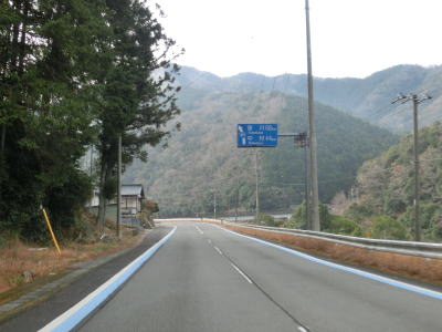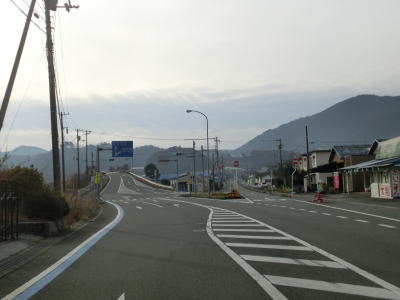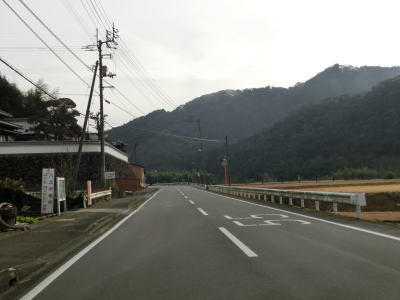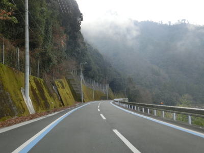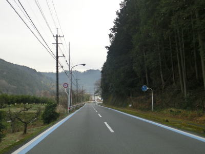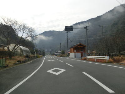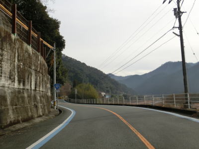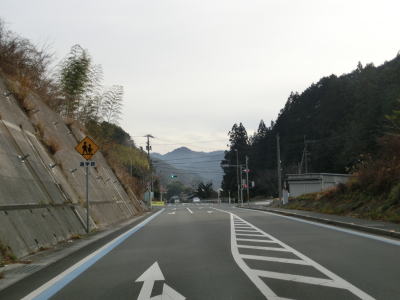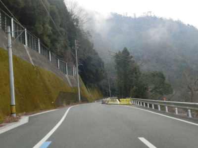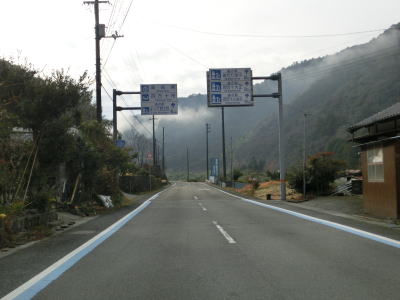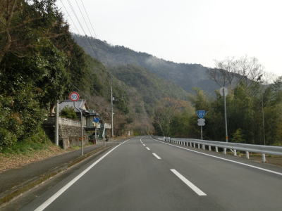 | R381交差点からは2車線道路となり緩やかな勾配を上って行く。交通量は若干増えるが多いと言える程ではない。JR予土線から離れると勾配がやや急になり、右に左にカーブしていると町境を越えて松野町に入る。勾配はそれほど急ではないが、急カーブが多く集落内を通っている事もあってやや走りにくさを感じる。路面に排水用の溝が掘られており、2輪車の走行に注意を促す看板が設置されている。もっとも交通量が多いせいか、轍部分の溝はほとんど残っていなかった。 | ||