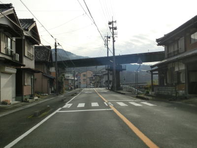 | 141.西ヶ方駅へは右折して橋を渡る | 142.路面のキロポストはR381の古市町交差点からの距離 | 143.川沿いに家屋が点在 |
