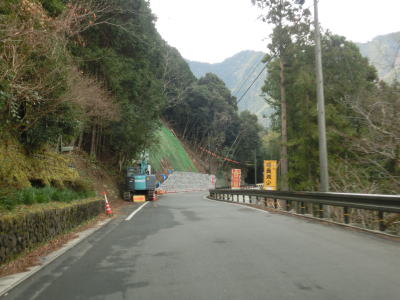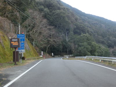 | 西土佐岩間集落を通り過ぎると異常気象時通行規制区間に入る。通行止になる基準値は時間雨量50mm超、連続雨量200mm超、積雪量30cm超となっている。異常気象時通行規制区間に入ると同時に道幅も狭くなり、それまでの2車線快走路から1.0〜1.5車線幅の狭路を走らなければならない。法面工事現場付近は多少広くなるもののセンターラインは描かれておらず2.0車線幅程度である。 | ||