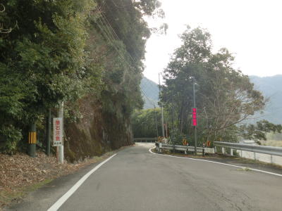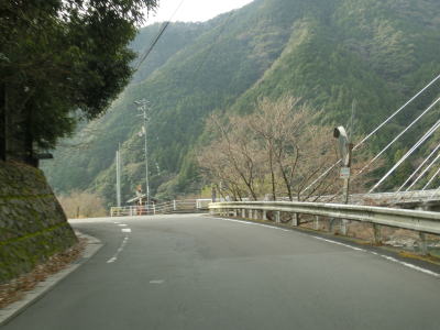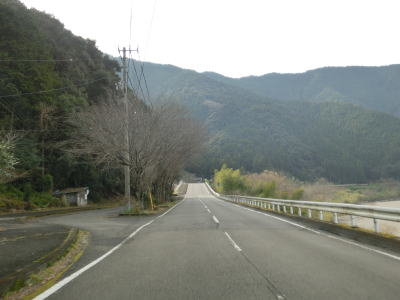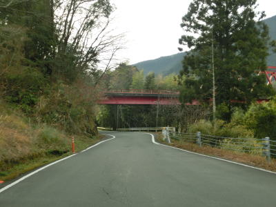 | 300m程度の対向車お知らせ区間を過ぎると北川大橋を渡るが、橋上と南側の少しだけセンターライン付きの2車線である。その後は2ヶ所目の対向車お知らせ区間に入り、約600mに渡って見通しの悪い狭路を走る。 | ||