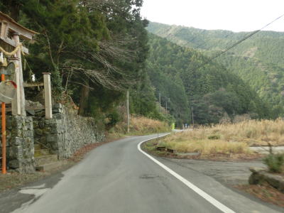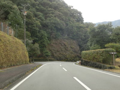| 本村集落の南部にある曽我神社付近からまた狭くなり、しばらくは本村集落に属すると思われる田畑の中を走る。田畑が途切れると対向車お知らせ区間に入るが、僅か100m程とは言え完全1.0車線幅のため、お知らせを無視して突っ込んでしまうと離合に相当苦労しそうな場所である。 線形が改良された場所を通るが、カーブは緩やかになっているもののセンターラインのない1.8車線幅しかなく完全な改良とは言い難い。その後は1.0〜1.5車線幅の狭路が続いているが、所々に広くなっている場所があるため対向車お知らせ区間ではない。 |
