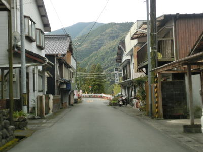 | 東集落を1.8車線幅程度の道路で通り抜けるが、家屋よりも田畑の方が多いような集落である。さらに四万十川沿いを走ると野加辺集落を通る。R381交差点からは最も大きな集落で郵便局や民宿もある。民宿の裏手には口屋内沈下橋があるが、橋及び東側の道路が通行止となっている。口屋内郵便局の前を通過した直後に高知r381との交差点を通過するが、案内標識が設置されてないため県道が交差しているのが分かりにくい。集落が途切れた先でr381の口屋内大橋の下を通る。 | ||